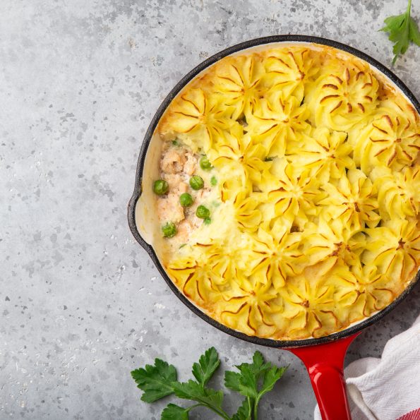Pour the tins of Elsinore Fish Chowder in a pie dish and spread or pipe the mashed potato on top