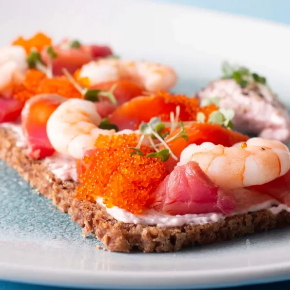 Add generous spoonfuls of Masago to your bed of Salmon and Prawns
